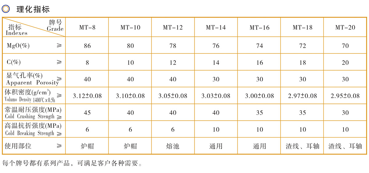 Magnesium-carbon bricks are made of fused magnesia and high carbon graphite as main raw materials, with proper amount of compound antioxidant and phenolic resin as binder and by high pressure moulding. The product has excellent corrosion resistance and thermal shock stability, and is widely used in converter, electric arc furnace and ladle lining.